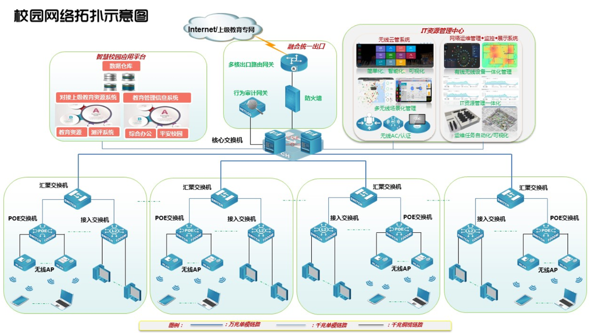 方案整体采用模块化的体系架构,将校园网分为网络核心区、教学区、办公区、生活区、服务器区、出口区等区域,网络核心区保证可靠、高效的数据交换,同时核心作为三层网关启用路由协议,教学区、办公区、生活区主要负责区域高速接入,网络出口区负责保证整个校园网络的安全,对不同的流量类型区分控制,保证带宽的有效使用,提升校园网用户的体验。