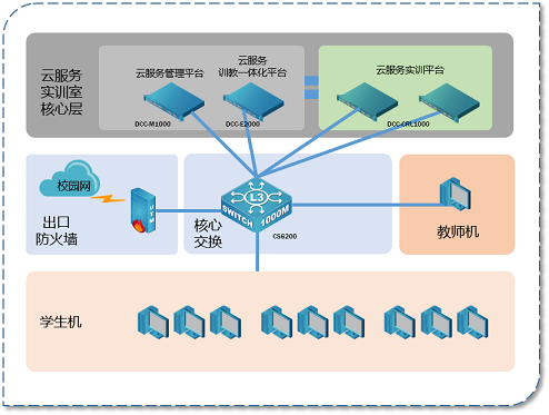 云服务训教一体化实训室由云服务管理平台、云服务训教一体化平台、云服务实训平台、交换机、防火墙、教师机、学生机组成。