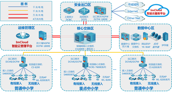普教城域网从管理、运维、使用和安全角度出发,整体上将城域网分为五个逻辑区域:核心交换区、校园网接入区、数据中心区、运维管理区和安全出口区,各区域职能分开,各司其职,界面清晰,易于管理和控制。